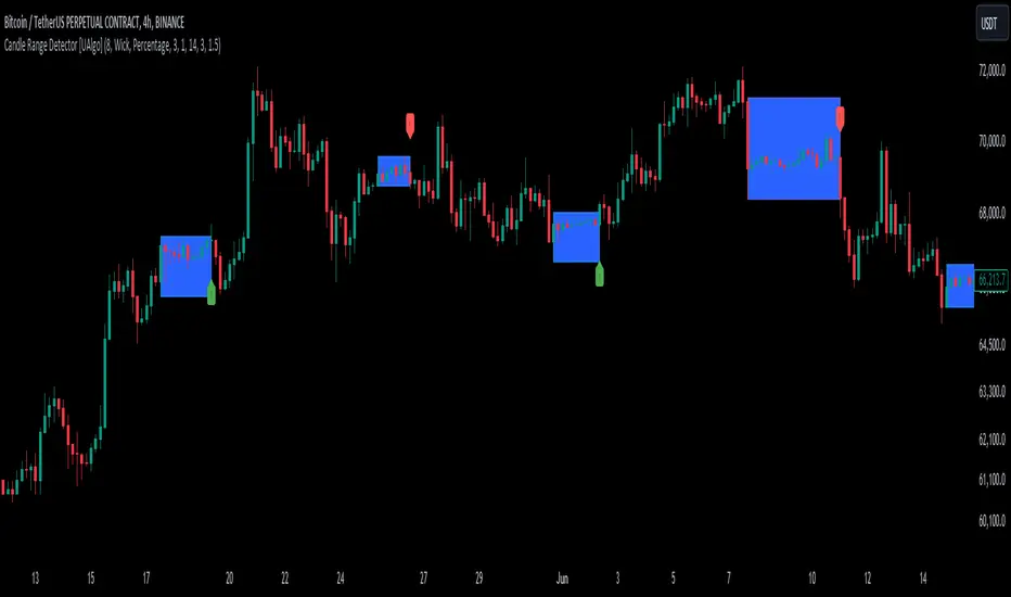 The "Candle Range Detector [UAlgo]" is a Pine Script™ indicator designed to identify trading opportunities based on the concept of price consolidation and breakout. It analyzes the price range of a specified number of previous candles and detects when subsequent candles stay within that range (consolidation). The indicator then highlights potential breakouts above or below the range and provides calculated Take Profit (TP) and Stop Loss (SL) levels based on your chosen method (percentage or Average True Range - ATR).