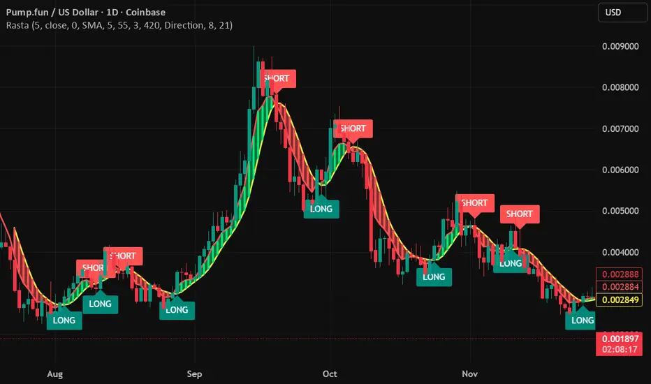 Rasta is a real-time, state-based momentum and structure indicator designed to help users visualize directional market bias and observe transitions between bullish and bearish regimes. The script combines an adaptive baseline (EMA) with a selectable smoothing layer to create a clean, readable structure that highlights how price momentum and trend context evolve over time.