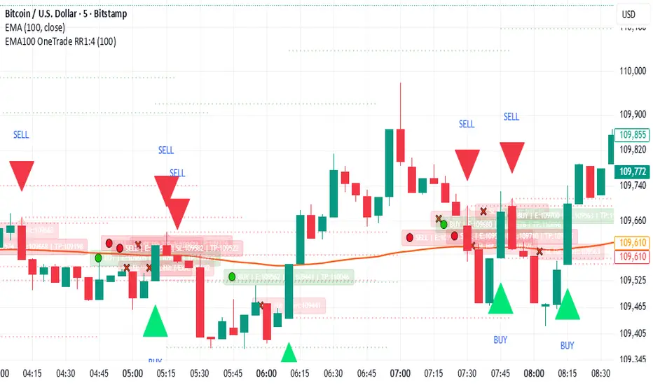 It uses a single 100-period EMA to define trend direction and waits for decisive candle closes across the EMA to trigger potential entries.