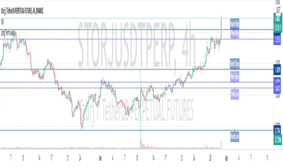 This shows and labels the highs and lows from the previous 4h, daily, weekly, monthly, quarterly and yearly session. By default it only shows weekly, monthly and yearly. It also has an option to use small labels (M vs Monthly High) to save your eyeballs. You may need to adjust your charts right hand margin to see them properly.