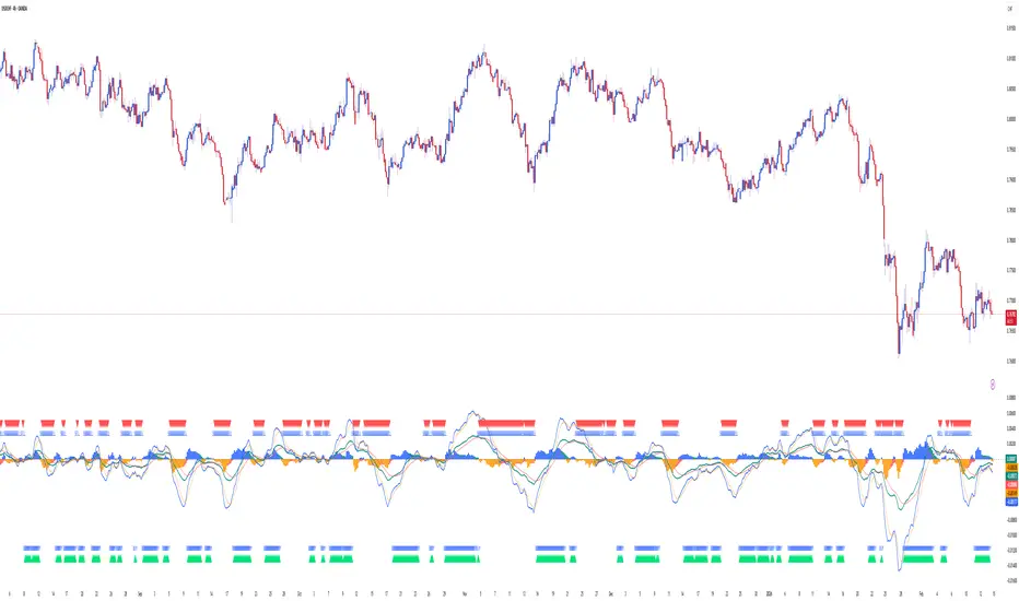 It combines two separate MACD indicators with different settings into a single tool so you can:
