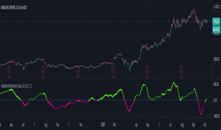 Adaptive momentum indicator that uses the NEW Dynamic Length Arguments! Shows how to use volatility to shorten or lengthen the momentum period.