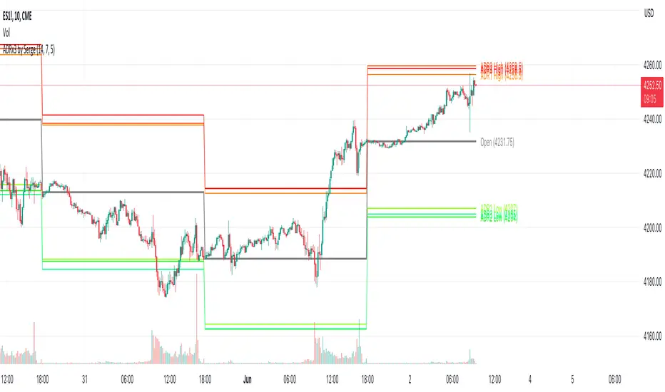 Indicator plots 3 sets of daily extremes based on Average Daily Ranges, to identify probable intraday reversal areas.