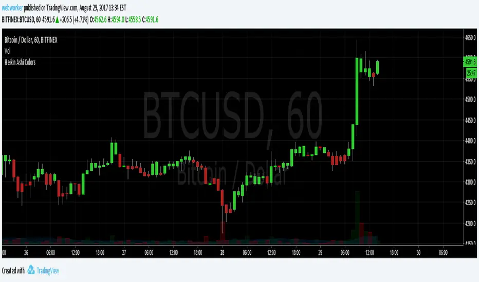 This script simply changes the colors on your candle and hollow candle charts to Heikin Ashi style colors without changing the values of the bars.