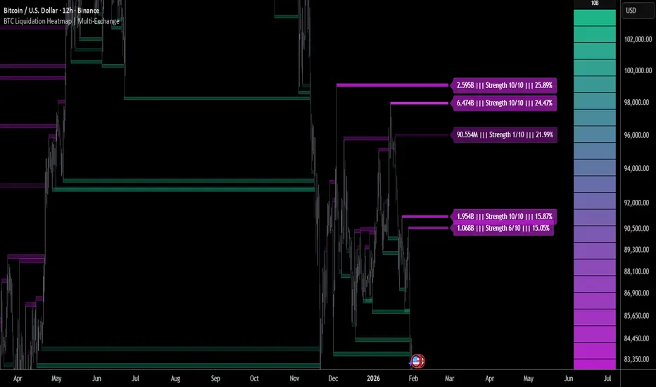 ⚙️Drop it on your BTCUSD chart and you'll see colored boxes above and below price. Purple zones are short liquidations (above price), teal zones are long liquidations (below price). The thermometer on the right shows you the intensity scale.