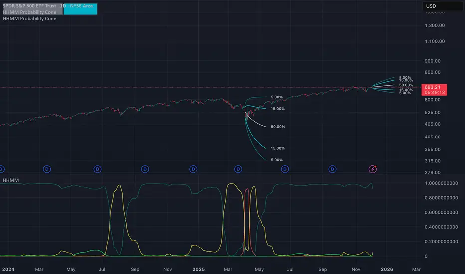 The Hierarchical Hidden Markov Model - Probability Cone Indicator employs Hierarchical Hidden Markov Models for forecasting future price movements in financial markets. HHMMs are statistical tools that predict transitions between hidden states, such as different market regimes, based on observed data. This makes them valuable for understanding market behaviours and projecting future price trajectories. As discussed in the Hierarchical Hidden Markov Model indicator, HHMMs predict future states and their associated outputs based on the current state and model parameters. This tool is fundamentally very similar to the traditional HMM. The application of the HHMM for generating a probability cone forecast is therefore also fundamentally the same between HMM and HHMM. Despite their significant similarity I will go through the same fundamental examples of how probability cone is generated for the HHMM as I did for the HMM probability cone.