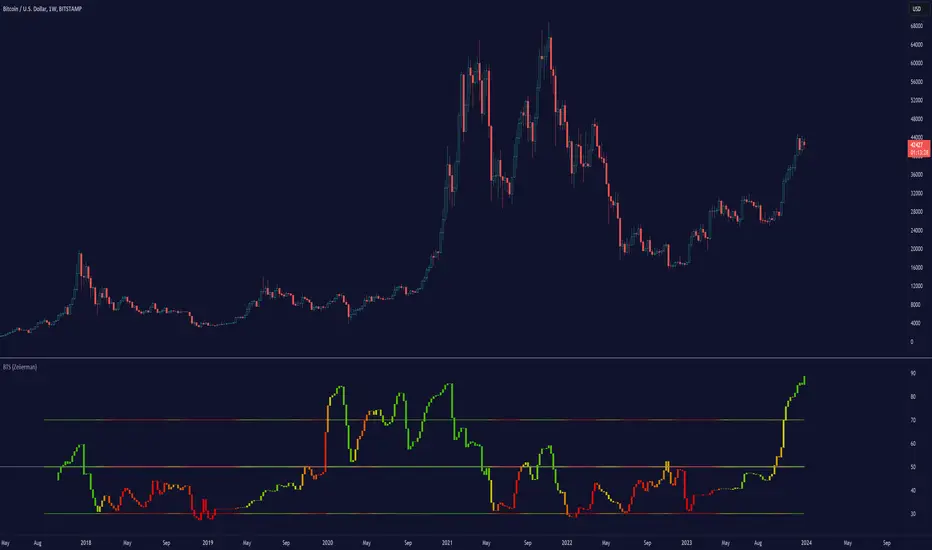 When BTS candles remain green or turn light yellow near the midline, it indicates balanced momentum as price consolidates during a temporary retracement. A renewed shift back to bright green candles from this area often signals the end of the pullback and the continuation of the uptrend.