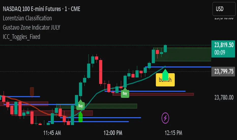 An adjustable Pine Script v6 “ICC” indicator that detects Indication → Correction → Continuation market structure across timeframes with optional volume confirmation, plots swing levels and zones, shows editable labels and toggleable yellow buy/sell triangle signals, and includes debug tools for tuning.