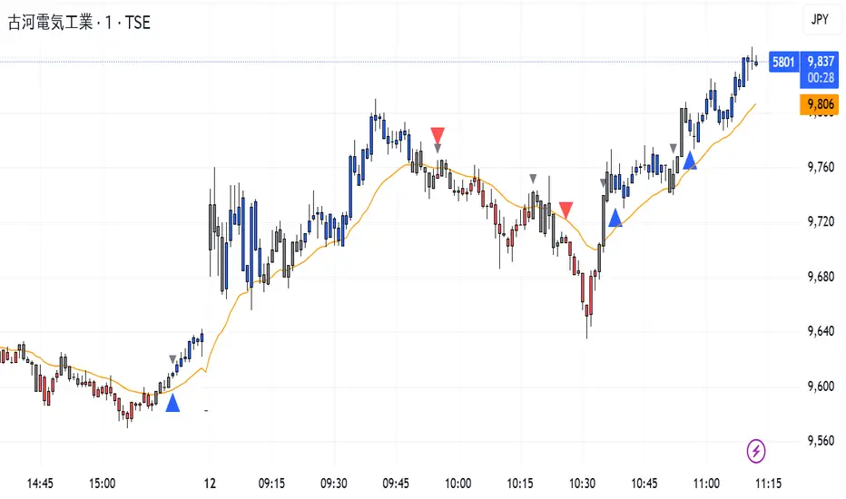 This custom TradingView indicator combines trend-based candle coloring with MACD reversal detection to generate clear entry and exit signals: