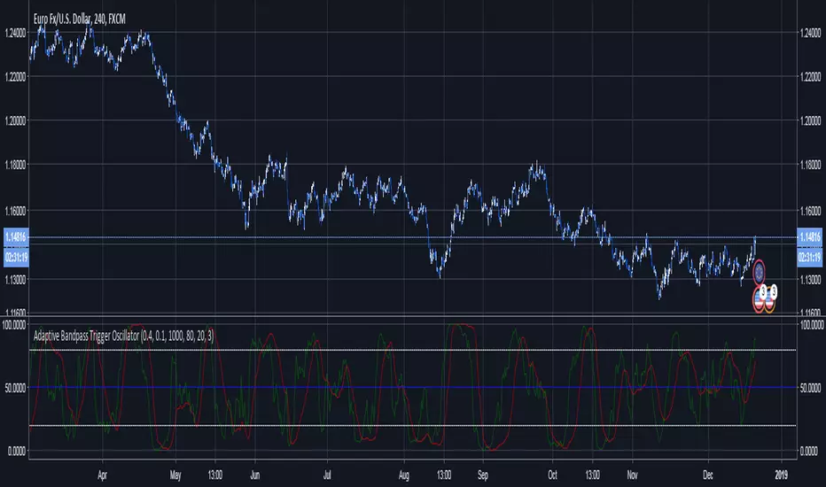 This is an improvement of the Adaptive Bandpass Trigger Oscillator. It adds an option for a multiplier to the dominant cycle to filter out smaller swings.