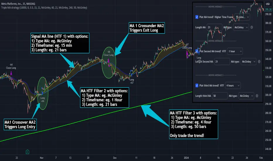 This Triple MA Strategy is basically the HTF Trend Filter displayed 3 times on the chart. For more infomation on how the MA with dynamic smoothing is calculated I recommend reading the following script: https://www.tradingview.com/script/WSfUYnNA-HTF-Trend-Filter-Dynamic-Smoothing/