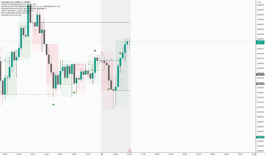 This indicator draws true candle structures on any timeframe below 5 minutes. It builds the HTF candle using intrabar data, then plots a high-low box, a darker open-close box, and a dashed midpoint line once each 5-minute candle closes. Designed for precision on lower timeframes without repainting.