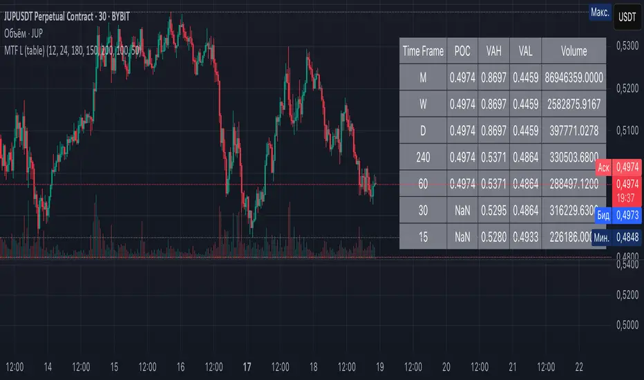 Table Format Display: Multi-Timeframe Liquidity Zones V6 (Table) specifically presents the information as a table (as opposed to plotting lines on the chart). Each row in the table typically corresponds to a timeframe (for example, Monthly, Weekly, Daily, 4H, 1H, 30M, 15M), and the columns list the calculated POC, VAH, VAL, and possibly the average volume for that timeframe’s look-back period. By structuring the data in a table, traders can quickly read off the exact price levels of these liquidity zones without having to visually trace lines. This format makes it easy to compare levels across timeframes or note where multiple timeframes’ levels cluster near the same price – a sign of especially strong support/resistance. The indicator uses a user-defined number of bars or length of history for each timeframe to calculate these values (so you can adjust how far back it looks to define the volume profile for each period).