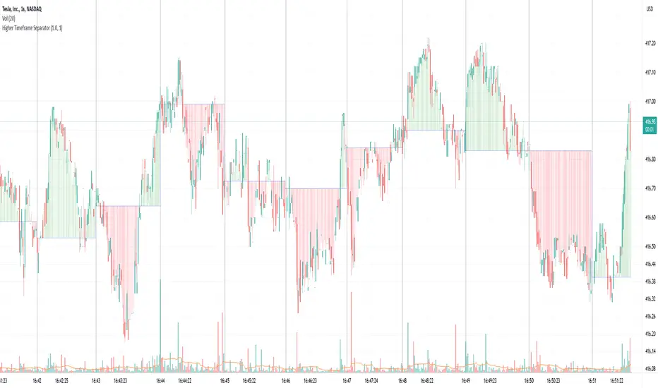This script helps visually identify when a higher timeframe candle starts by drawing a vertical line. It also shades the area above or below the opening price, making it easier to track price movement relative to the higher timeframe.