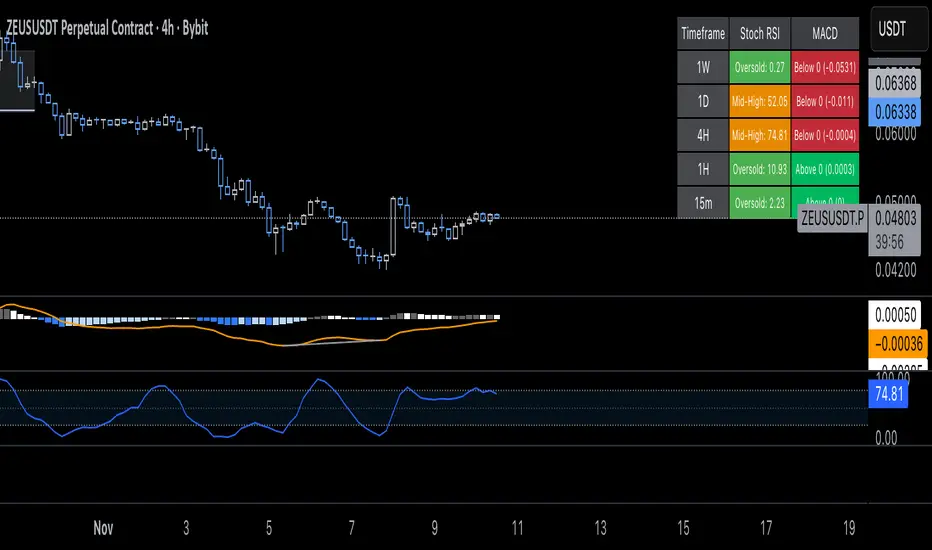 Overall, the MTF Stoch RSI + MACD Summary acts as a comprehensive dashboard that integrates momentum and trend indicators across multiple timeframes. By presenting data in a simplified visual layout, it enables traders to make more informed decisions based on the consistency of market signals. This facilitates clearer identification of overbought or oversold conditions, confirmation of trend strength, and early detection of potential reversals, making it a valuable tool for multi-timeframe technical analysis.