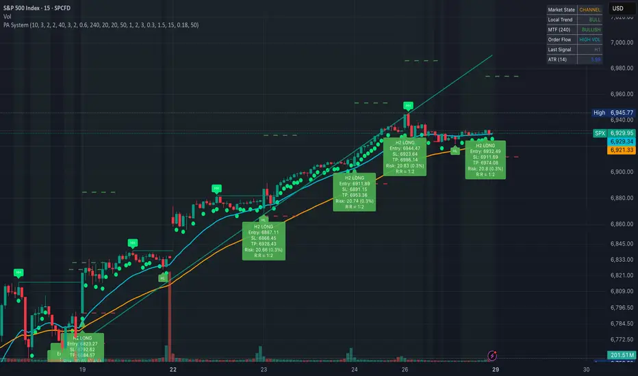 PA System is a comprehensive price action trading indicator that combines Smart Money Concepts (SMC), market structure analysis, and multi-timeframe confirmation to identify high-probability trade setups. Designed for both manual traders and algorithmic trading systems.
