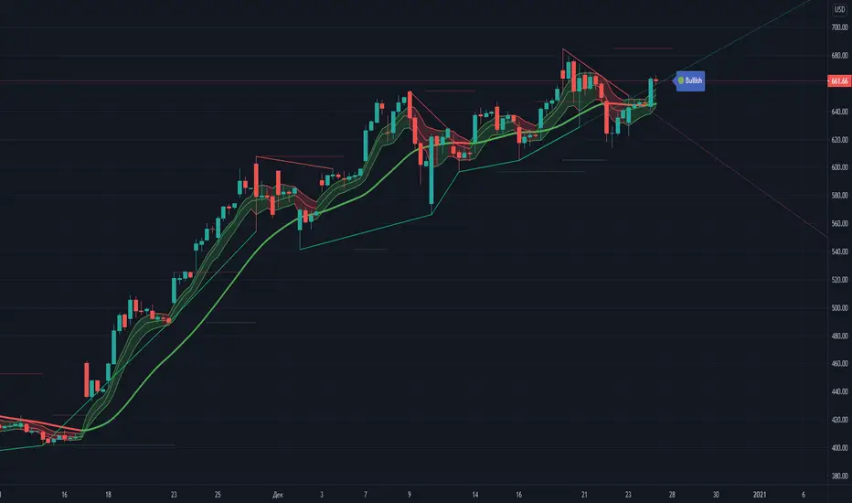 Detection and color visualization of the trend direction by constructing a candle envelope based on exponential moving averages and a double exponential moving line.