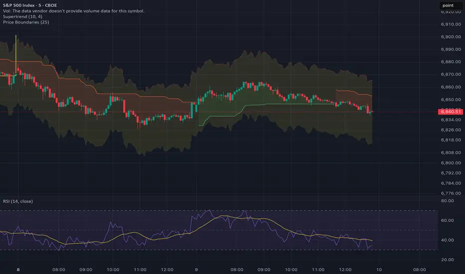 You can set the distance between the current price and each boundary using a user-defined input. For example, if the price is 6250 and the distance is set to 25, the indicator will automatically draw lines at 6275 (upper boundary) and 6225 (lower boundary). These levels update every candle based on the closing price.