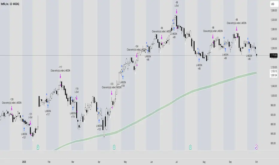 • It is a long-only system by default. If you enable “Always Flip,” the script will alternate long/short each lunar phase, but that is more experimental.