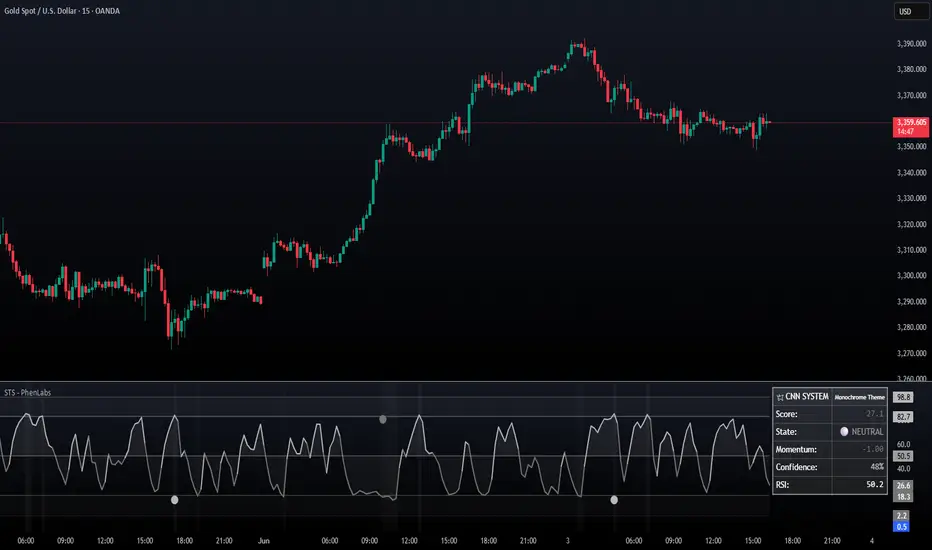 CNN Statistical Trading System [PhenLabs] transforms traditional technical analysis by applying machine learning concepts directly to price action. Through six specialized convolution kernels, it detects momentum shifts, reversal patterns, consolidation phases, and breakout setups simultaneously. The system combines these pattern detections using adaptive weighting based on market volatility and trend strength, creating a sophisticated composite score that provides both directional bias and signal confidence on a normalized -1 to +1 scale.