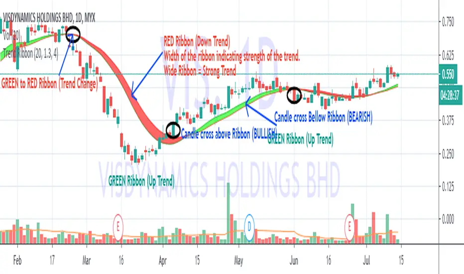 RED RIBBON = DOWN TREND (Short Term EMA below Long EMA )
