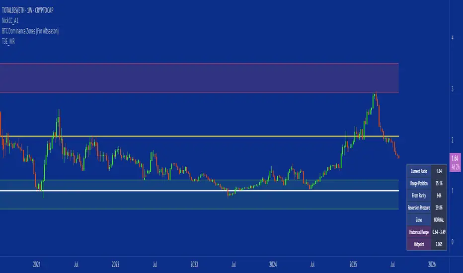 The TOTAL3ES/ETH Mean Reversion indicator is a specialized tool designed exclusively for analyzing the ratio between TOTAL3 excluding stablecoins (TOTAL3ES) and Ethereum's market capitalization. This ratio provides crucial insights into the relative performance and valuation cycles between altcoins and ETH, making it an essential tool for cryptocurrency portfolio allocation and market timing decisions.