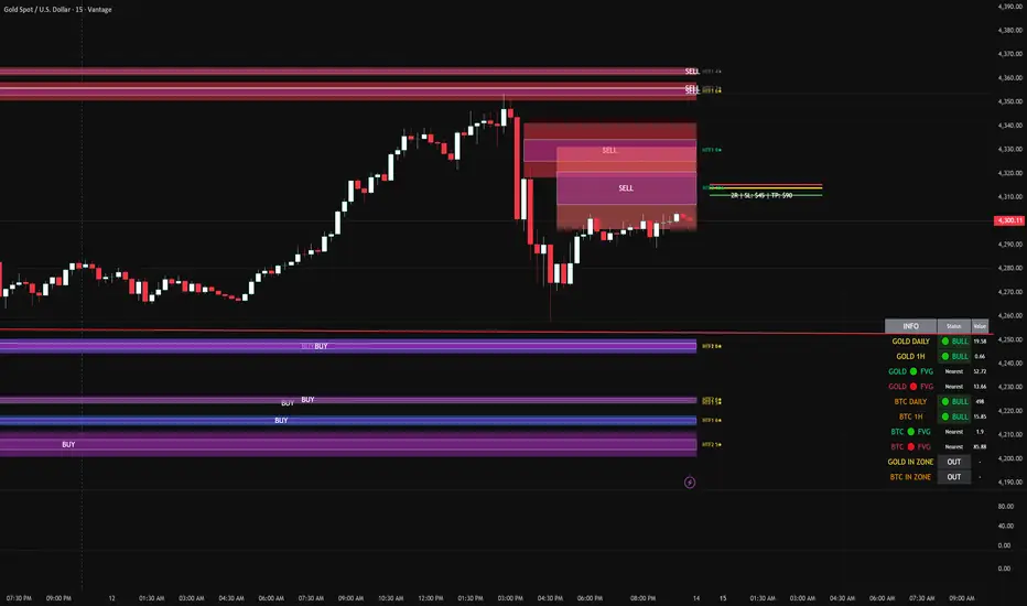 Advanced FVG detector with dual higher timeframe analysis, intelligent strength scoring (0-11), and multi-timeframe confluence detection. Features sweet spot entry zones, automatic R:R lines, real-time IN ZONE alerts, and comprehensive market intelligence table.