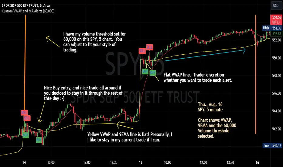 The script generates alerts for buy and sell trades using VWAP and volume threshold that you select.