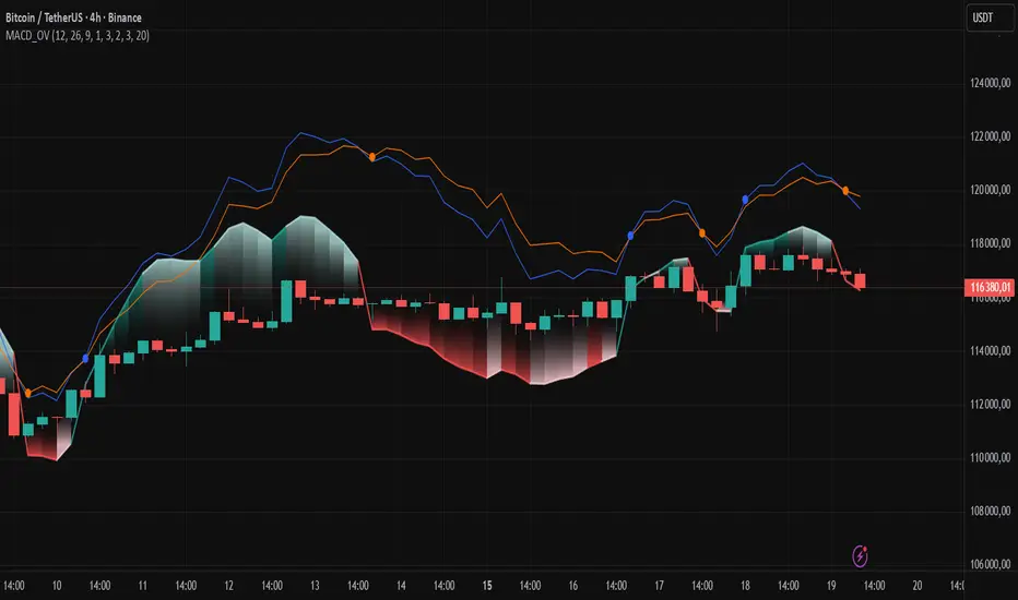 The "MACD Scaled Overlay" indicator is designed to simplify trend and reversal analysis by integrating MACD signals with the price chart. The MACD Scaled Overlay is scaled relative to the average candle range, allowing the lines and histogram to dynamically adjust to market volatility. Additionally, the indicator enables the detection of divergences (bullish and bearish, both regular and hidden) based on the traditional MACD histogram (before scaling), ensuring consistency with classic divergence analysis. The indicator is most effective when combined with other technical analysis tools, such as Fibonacci levels, pivot points, or trend lines.
