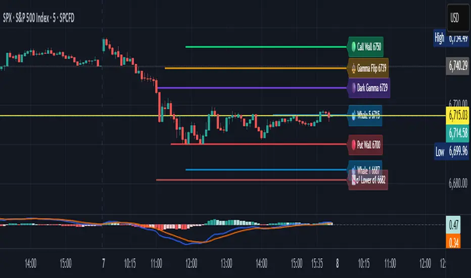 Options Levels 🎯 plots key institutional and options-based levels directly on your chart — including Call Wall, Put Wall, Gamma Flip, Dark Gamma, five Whale levels, and Sigma deviation bands (σ1/σ2).