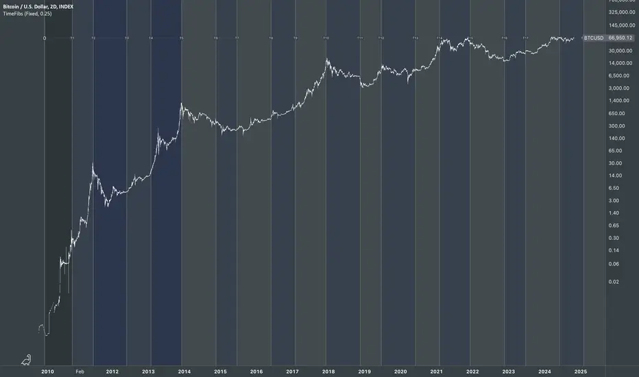 The "Fibonacci Time Periods" indicator uses power exponents of the constant Phi based on your custom time period to generate Fibonacci sequence-based progression on a given chart. This tool can help to anticipate the timing of potential turning points by highlighting Fib time zones where significant price movements may occur.