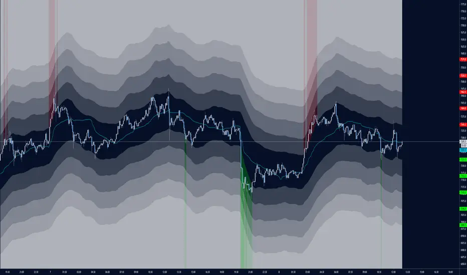 It works by projecting five 0.5% std deviations from the ema as volatility bands to help you scale into shorts and longs. generally flat scaling will work better than ascending. there is no SL logic for the strategy - positions should be closed when prices crosses back through the VWMA . To be used on lower timeframes only as the bands to do not expand or contract according to ATR
