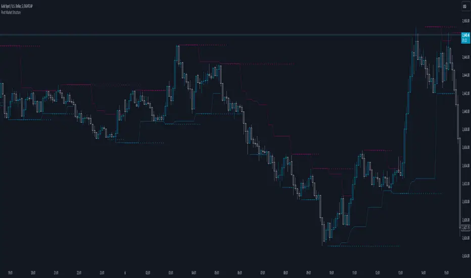 - Pivot Point Calculation: Pivot Point Highs are calculated by the number of bars with lower highs on either side of a Pivot Point High calculation. Similarly, Pivot Point Lows are calculated by the number of bars with higher lows on either side of a Pivot Point Low calculation. The script draws a line from/to every calculated pivot point to highlight market structure extremes. It can optionally extend these pivot lines to the left for added context, providing historical reference for decision-making.