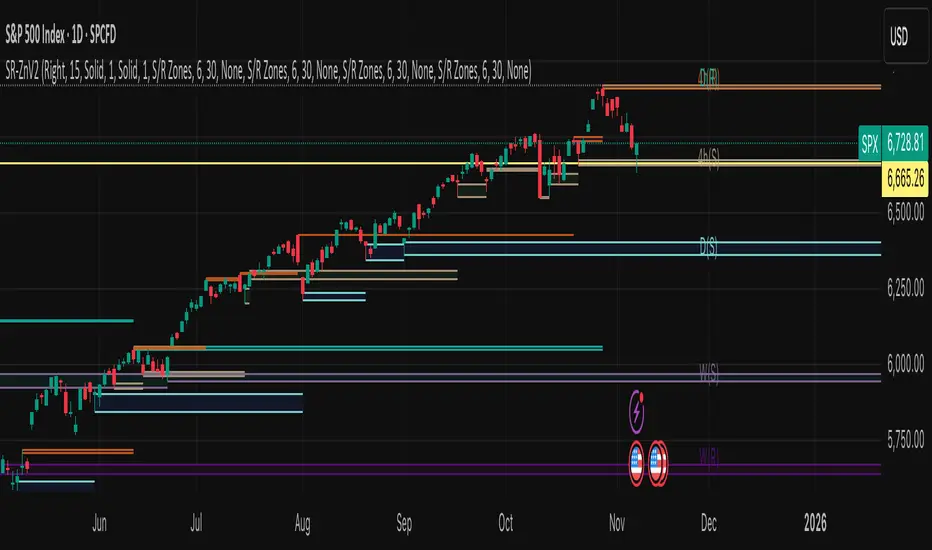 // Added optional time frame labels to active S/R zones, with left and right options as well as option to adjust how far to the right label is set.