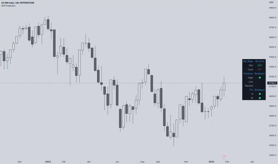 The indicator will show its prediction of whether the price will break the previous high/low with the win rate.