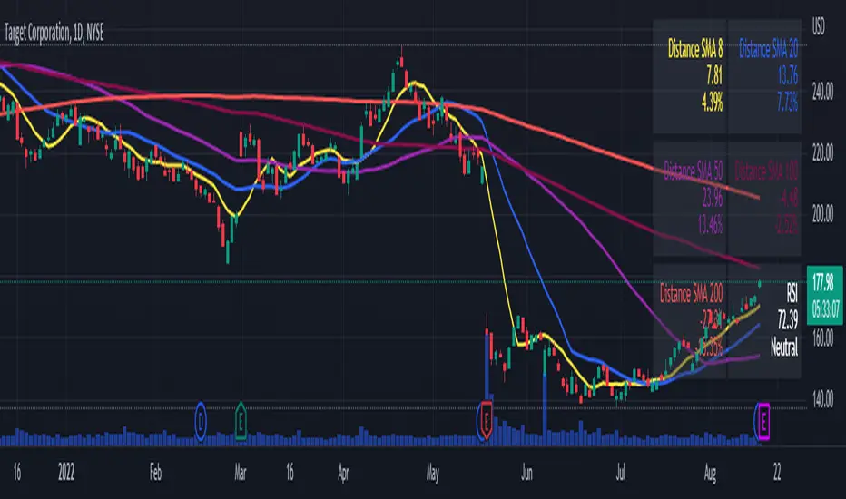 This indicator shows 5 configurable SMAs. It also shows a table with the distance of each one with respect to the last closing price. It also shows if the RSI is in the overbought or oversold zone. You can add alerts if you wish.