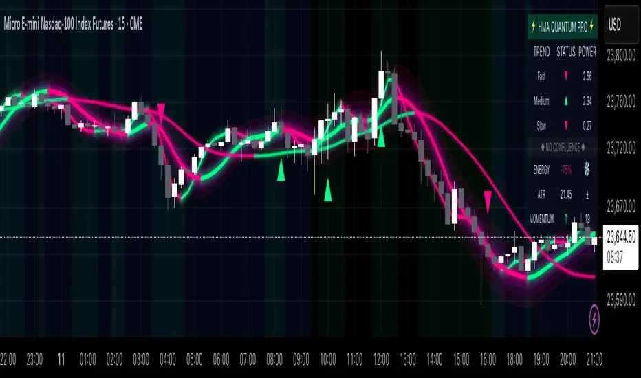 Unlike traditional moving average indicators, the HMA Quantum Pro eliminates lag while maintaining smoothness, providing traders with faster signals without sacrificing reliability. The quantum field visualization adds a new dimension to price action analysis by creating dynamic zones that adapt to market volatility.