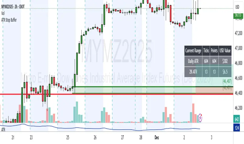 OTA ATR indicator calculates and displays the Daily Average True Range (ATR), and two customizable ATR percentage values in a clean table format. It provides values in ticks and points, helping traders set stop-loss buffers based on market volatility.