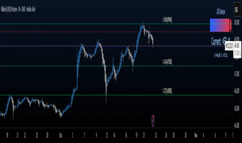 The ATR Gauge - Audiophile Style indicator is a custom visualization tool. It's designed to give you a quick, retro-inspired snapshot of market volatility using the Average True Range (ATR) metric. Think of it as a dashboard widget styled like the VU meters on old-school audiophile equipment (e.g., vintage stereo amps from brands like McIntosh or Marantz)—simple, elegant, and functional. It sits in one of the corners of your chart and helps you gauge how "hot" or "cool" the current price action is compared to recent levels.