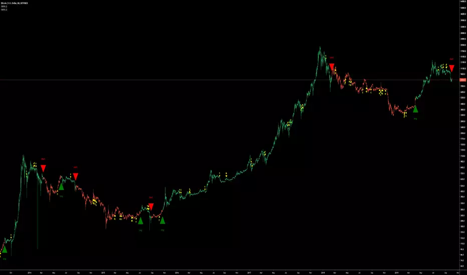 Yellow Triangles = Possible Trend Change = if you are long, Sell, If you are Short, Cover.