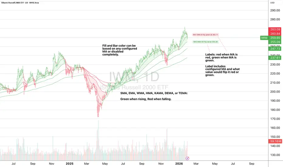 The script also supports optional price↔MA fills, optional bar/candle coloring driven by any selected MA, and alerts when MA slope direction changes.