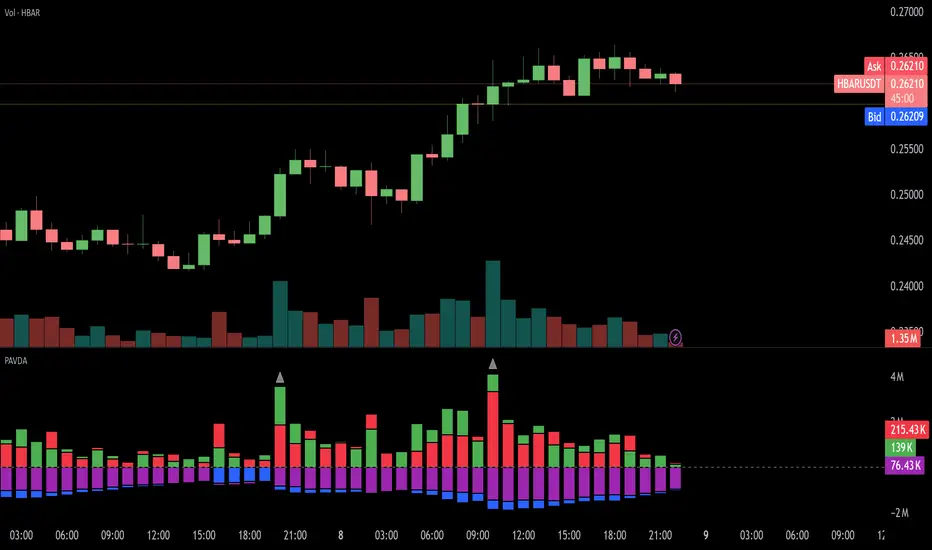 The bottom part of the indicator is the same as above but with different colors and a moving average length that helps see gradually buying or selling increase or decrease. The buy volume is blue and purple volume is purple for the bottom half of the indicator.