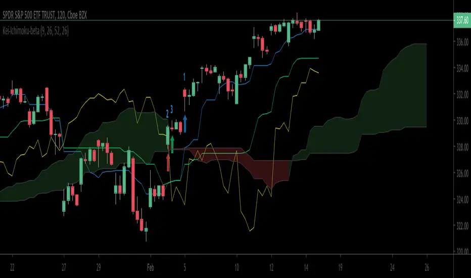 This is a test version of Ichimoku, instead of plot chiko span backward 26 bars, it draws price at 26 bars backward at the current bar.