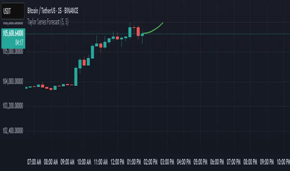 This indicator projects future price movement using a second-order Taylor Series expansion, calculated from a smoothed price (EMA). It models price momentum and acceleration to generate a forward-looking trajectory.