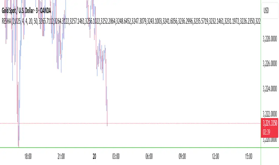 The RESHA indicator is a simple tool that allows traders to manually define multiple horizontal price levels on the chart. These levels are displayed as horizontal lines, each extending a customizable number of candles forward. Traders can input a comma-separated list of prices, which are then plotted automatically on the chart.