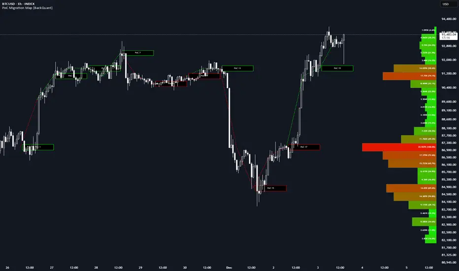 A volume structure tool that builds a side volume profile, extracts rolling Points of Control (PoCs), and maps how those PoCs migrate through time so you can see where value is moving, how volume clusters shift, and how that aligns with trend regime.