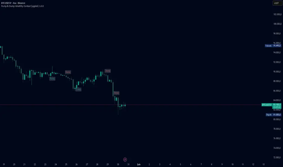 Pump and Dump Volatility Context is a market behavior indicator designed to highlight unusual price expansion and contraction by evaluating how current price action deviates from its recent volatility structure.