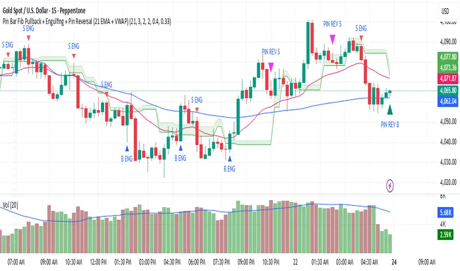 Pin Bar Fib Pullback + Engulfing + Pin Reversal (21 EMA + VWAP)