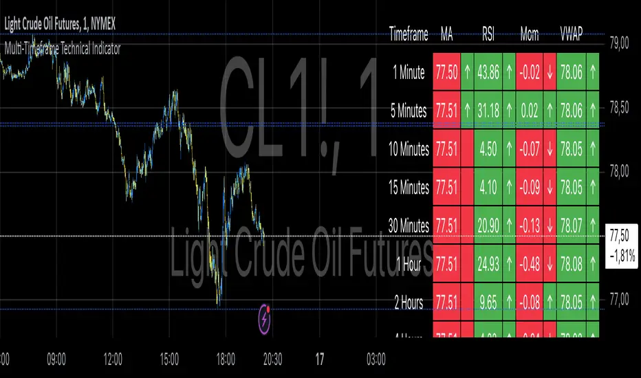 This Multi-Timeframe Technical Indicator is designed for use in financial markets to assist traders in evaluating various key technical indicators across multiple timeframes. The indicator displays a table that includes the values of Moving Averages (MA), Relative Strength Index (RSI), Momentum, and VWAP for a range of timeframes, allowing for the evaluation of trends in real-time.