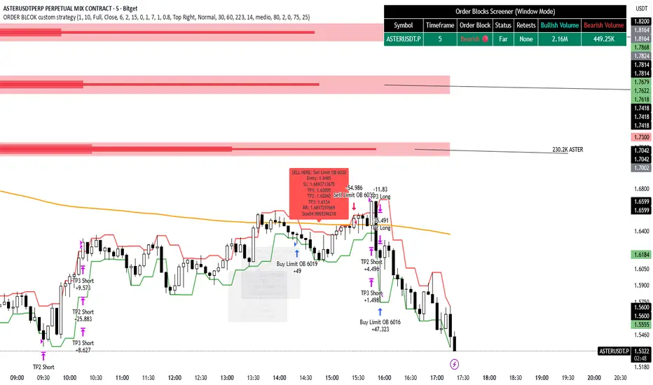 The **OB Matrix Strategy** is based on the identification of **bullish and bearish Order Blocks** and the management of conditional orders with multiple Take Profit (TP) and Stop Loss (SL) levels. It uses trend filters, ATR, and percentage-based risk management.